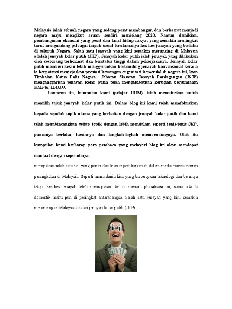 Ibarat orang mengantuk disorongkan bantal mereka menerima wang tersebut tanpa memikirkan apa yang bakal berlaku. Jenayah kolar putih adalah tindakan jenayah yang timbul daripada peluang yang dibuat oleh kedudukan sosial seseorang terutama pekerjaan mereka. We would like to show you a description here but the site wont allow us.